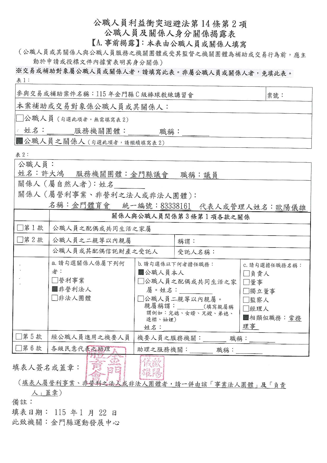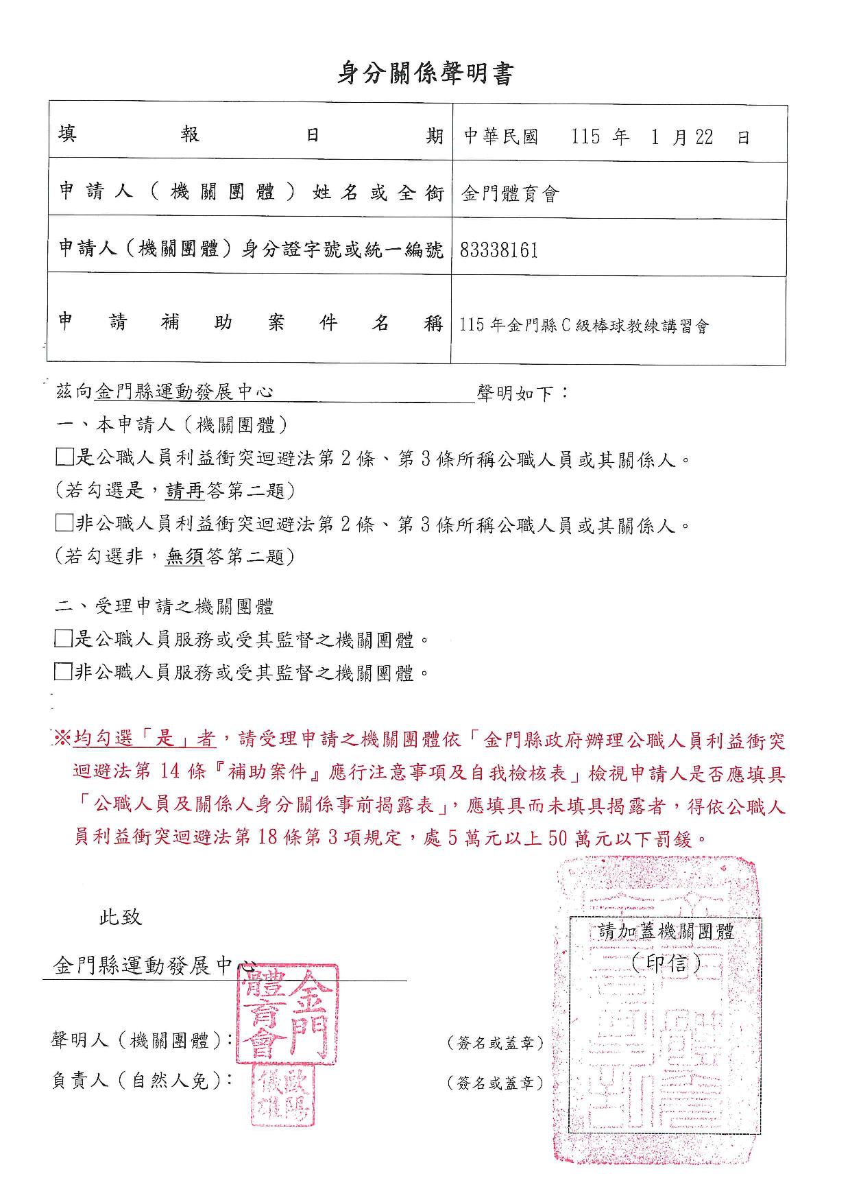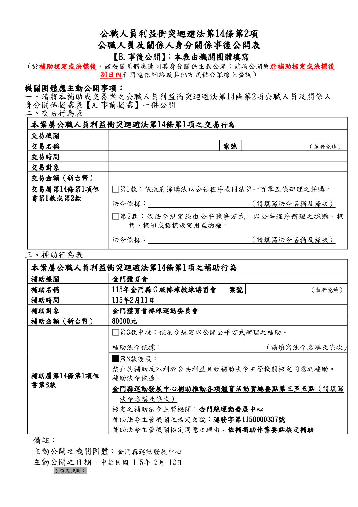 公告115年度「本場提供金門體育會暨所屬各單項運動委員會及本縣立案體育團體辦理各項活動補助」
