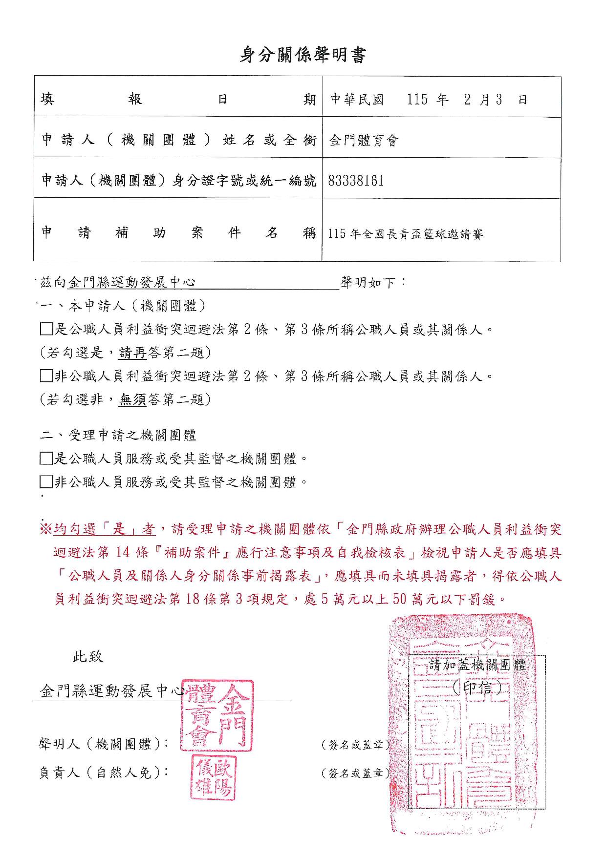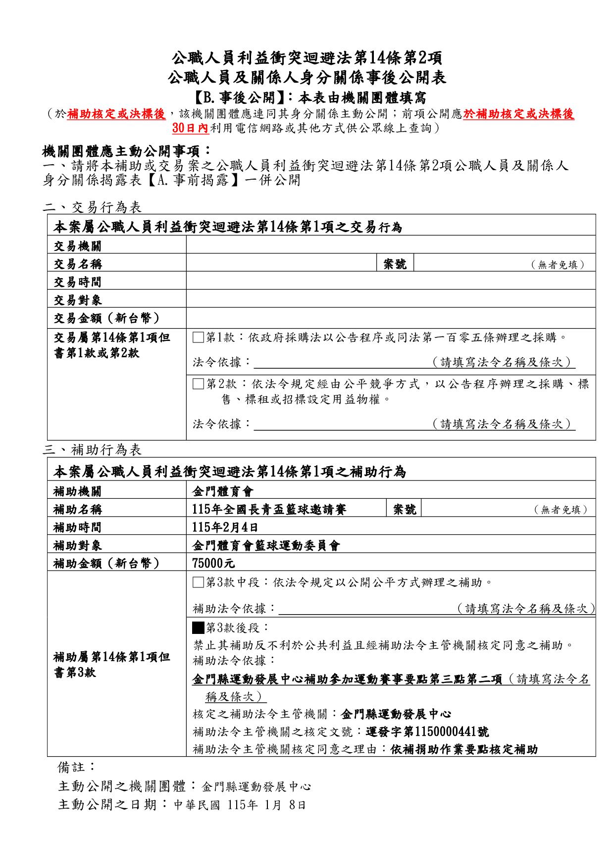 公告115年度「本場提供金門體育會暨所屬各單項運動委員會及本縣立案體育團體辦理各項活動補助」