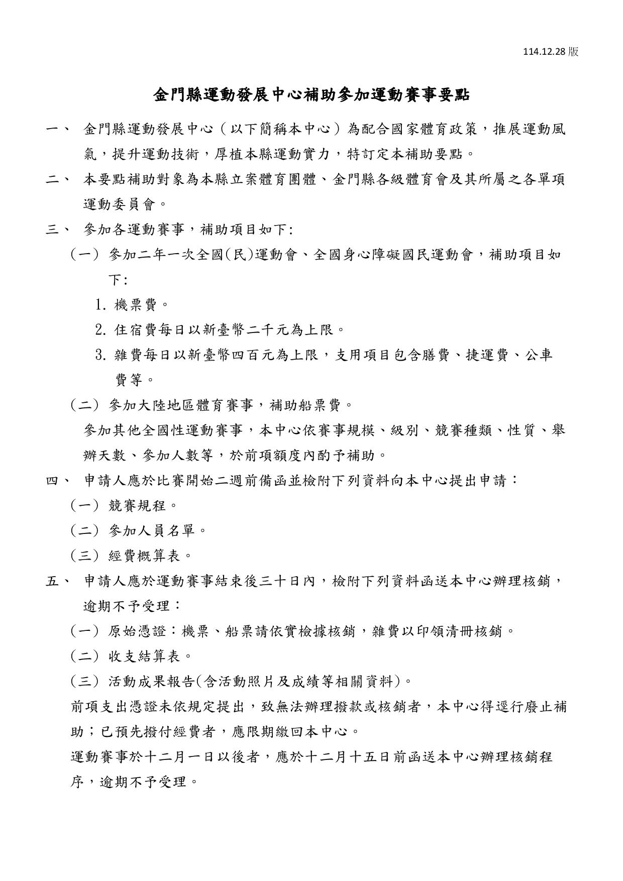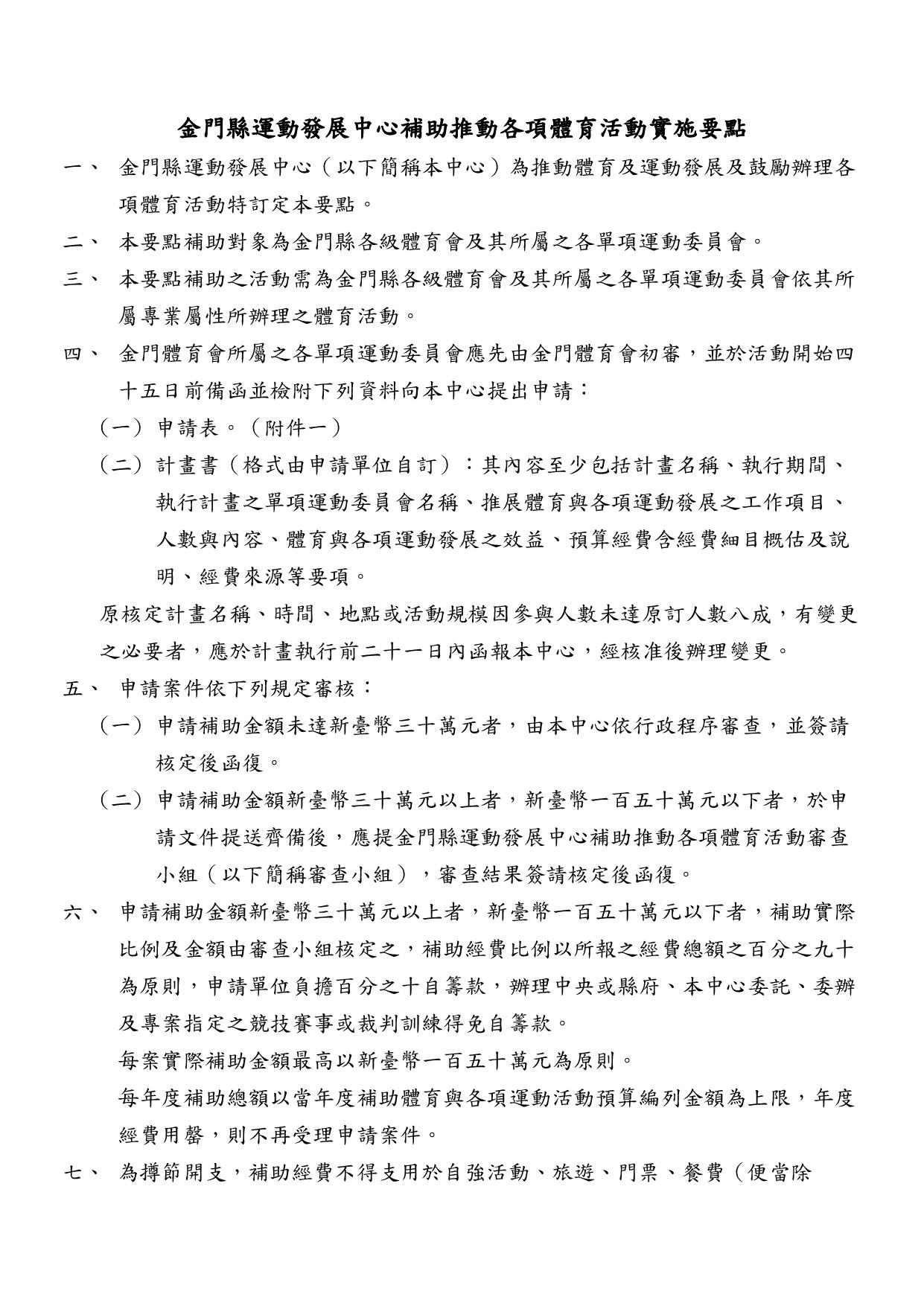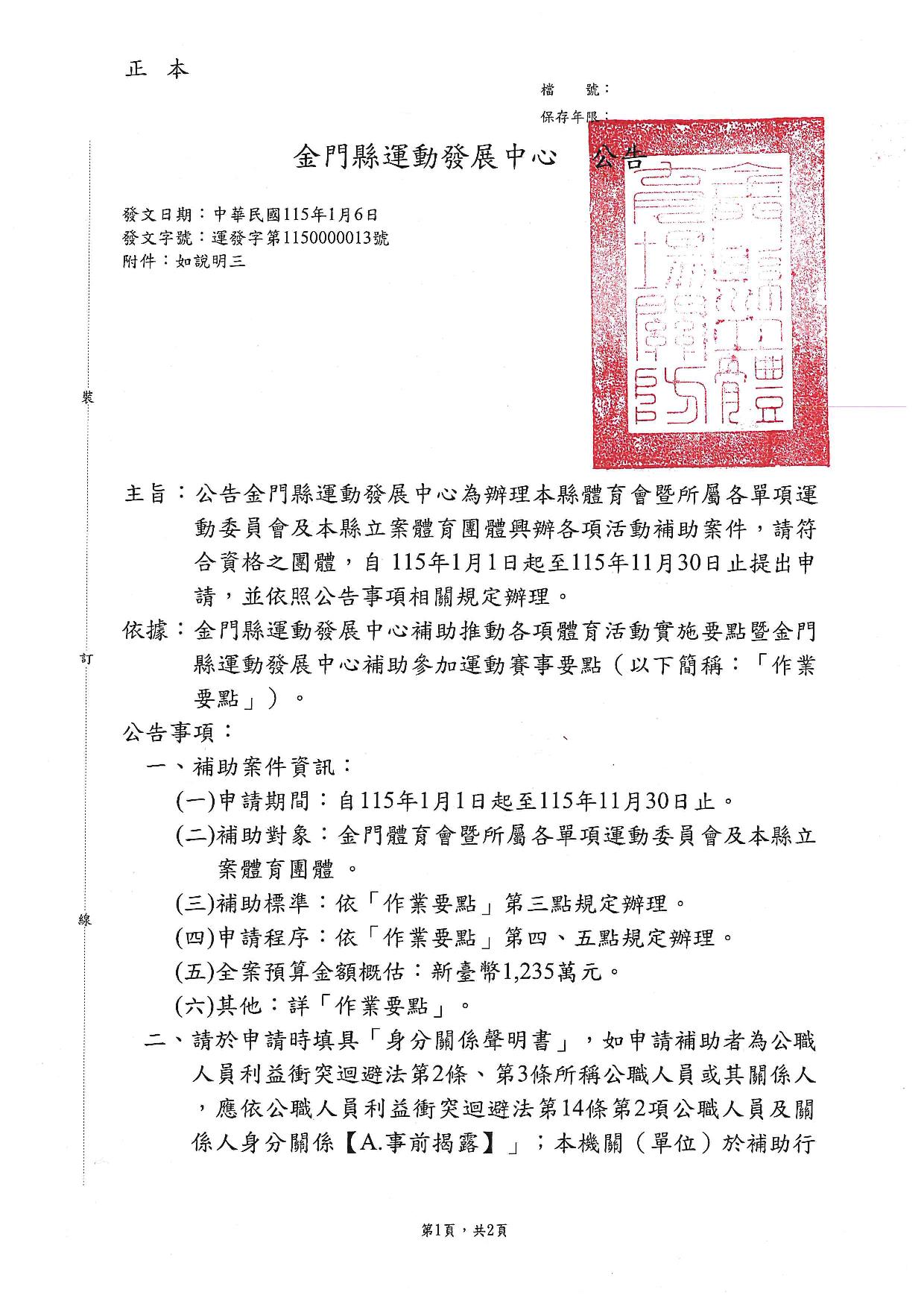 115年金門縣運動發展中心補助參加運動賽事要點、金門縣運動發展中心補助推動各項體育活動實施要點、公告