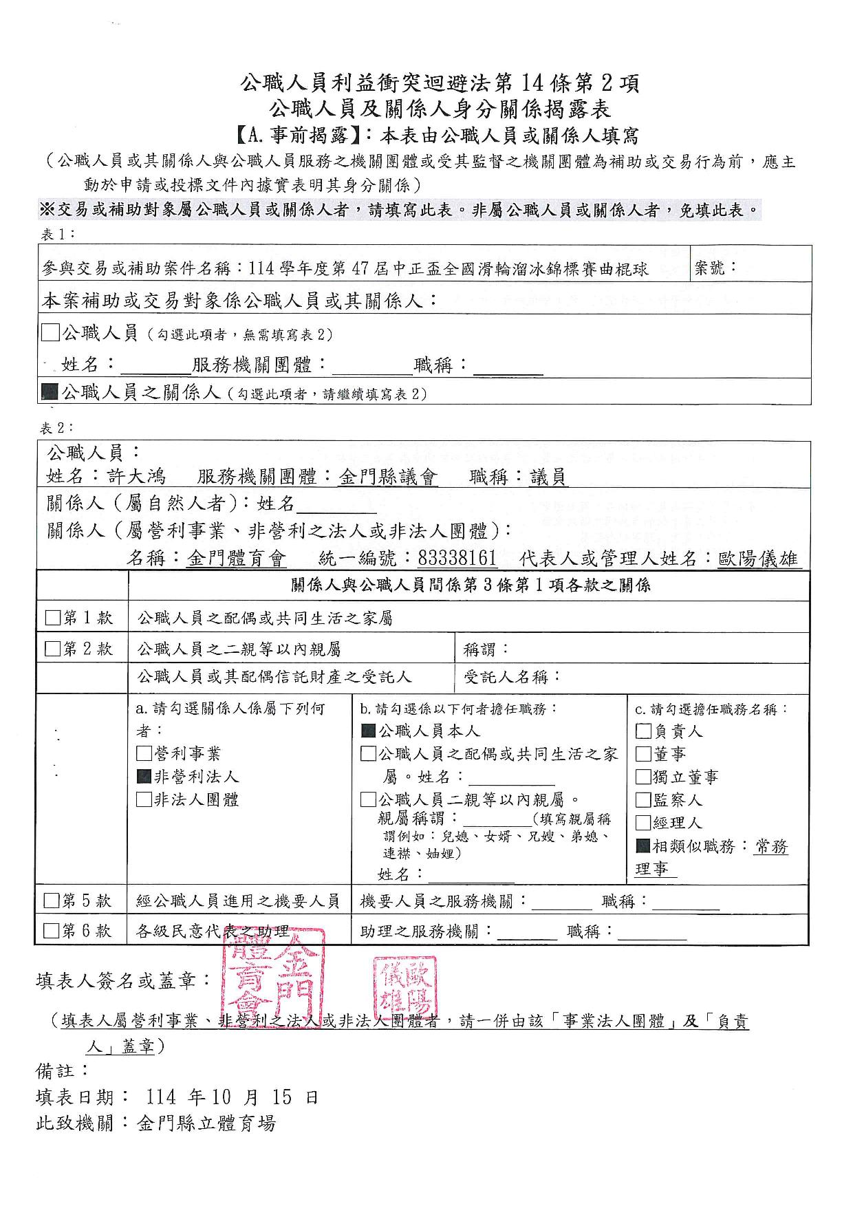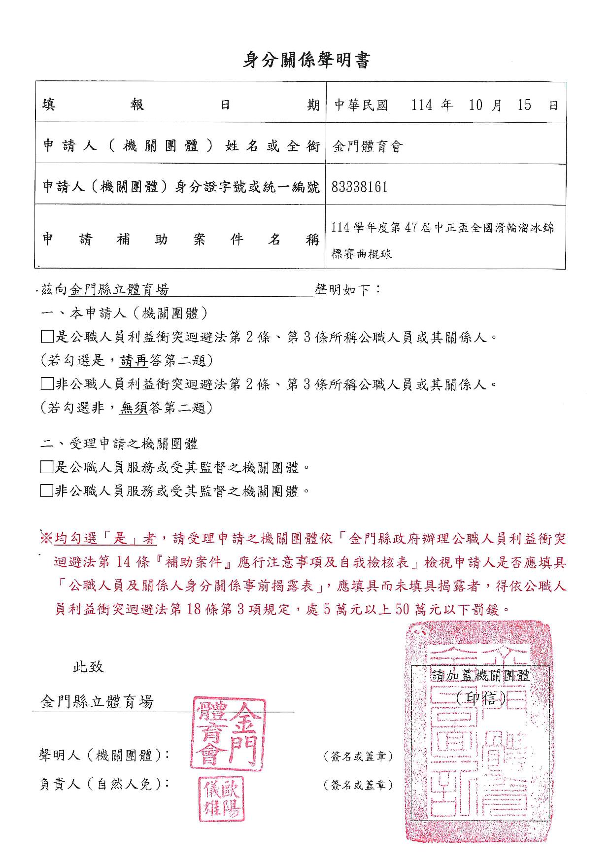 補助金門體育會滑輪溜冰運動委員會第47屆中正盃溜冰金標賽曲棍球活動經費