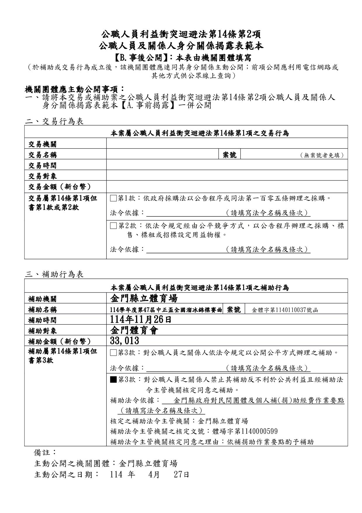 公告114年度「本場提供金門體育會暨所屬各單項運動委員會及本縣立案體育團體辦理各項活動補助」