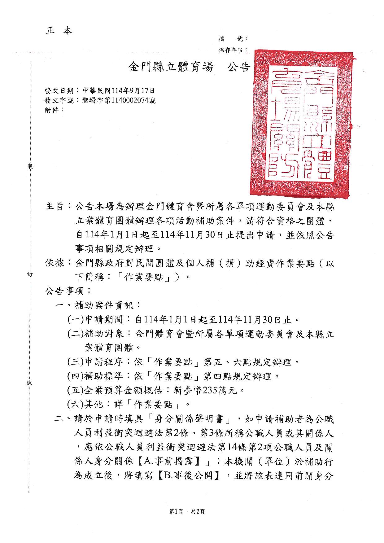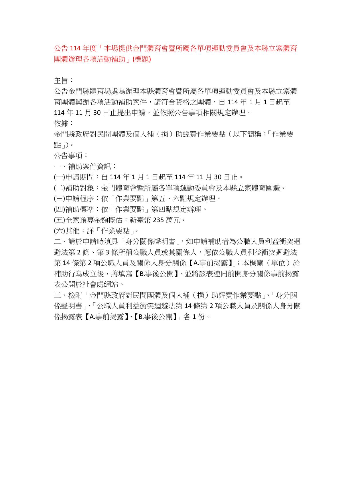 公告114年度「本場提供金門體育會暨所屬各單項運動委員會及本縣立案體育團體辦理各項活動補助」