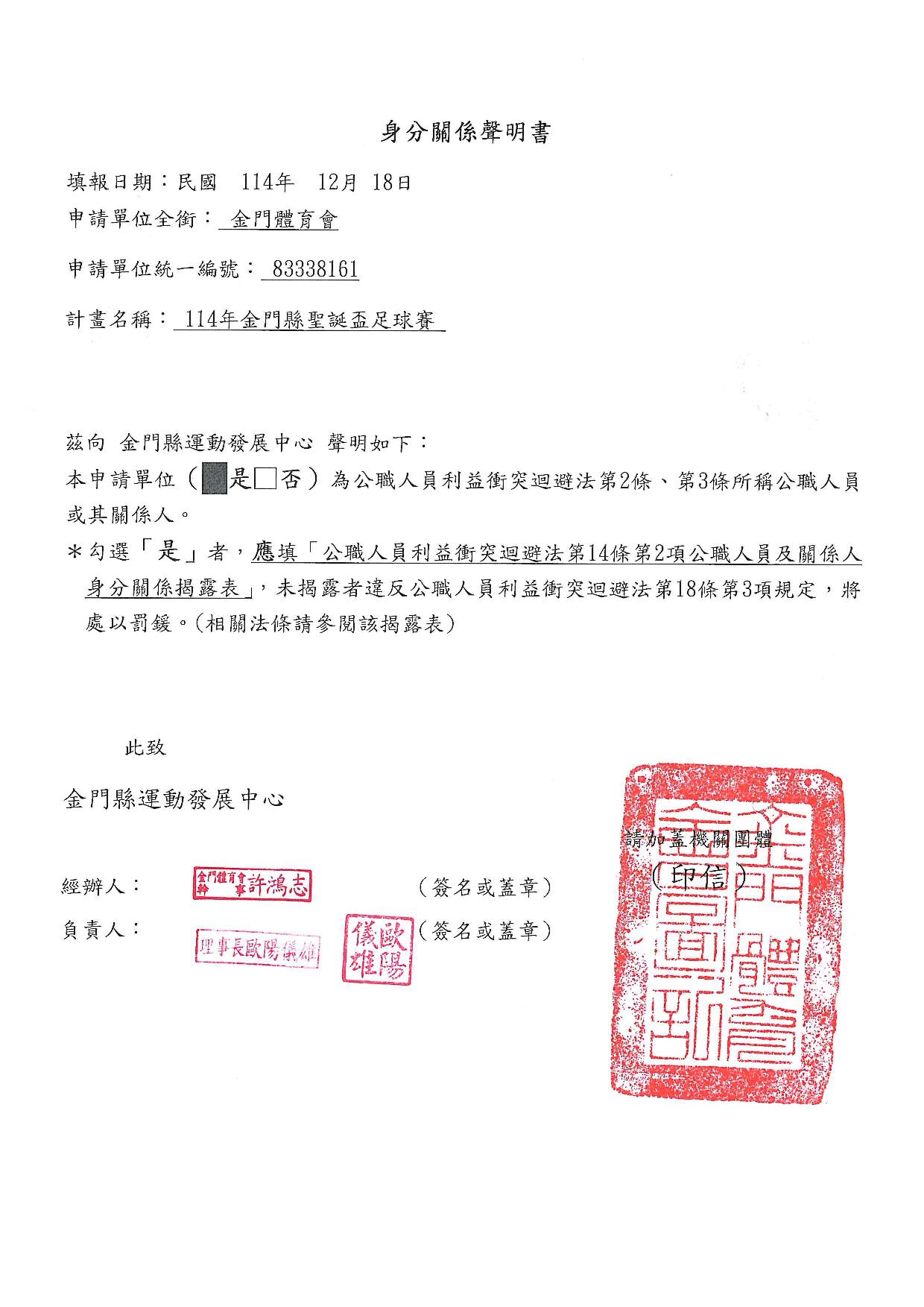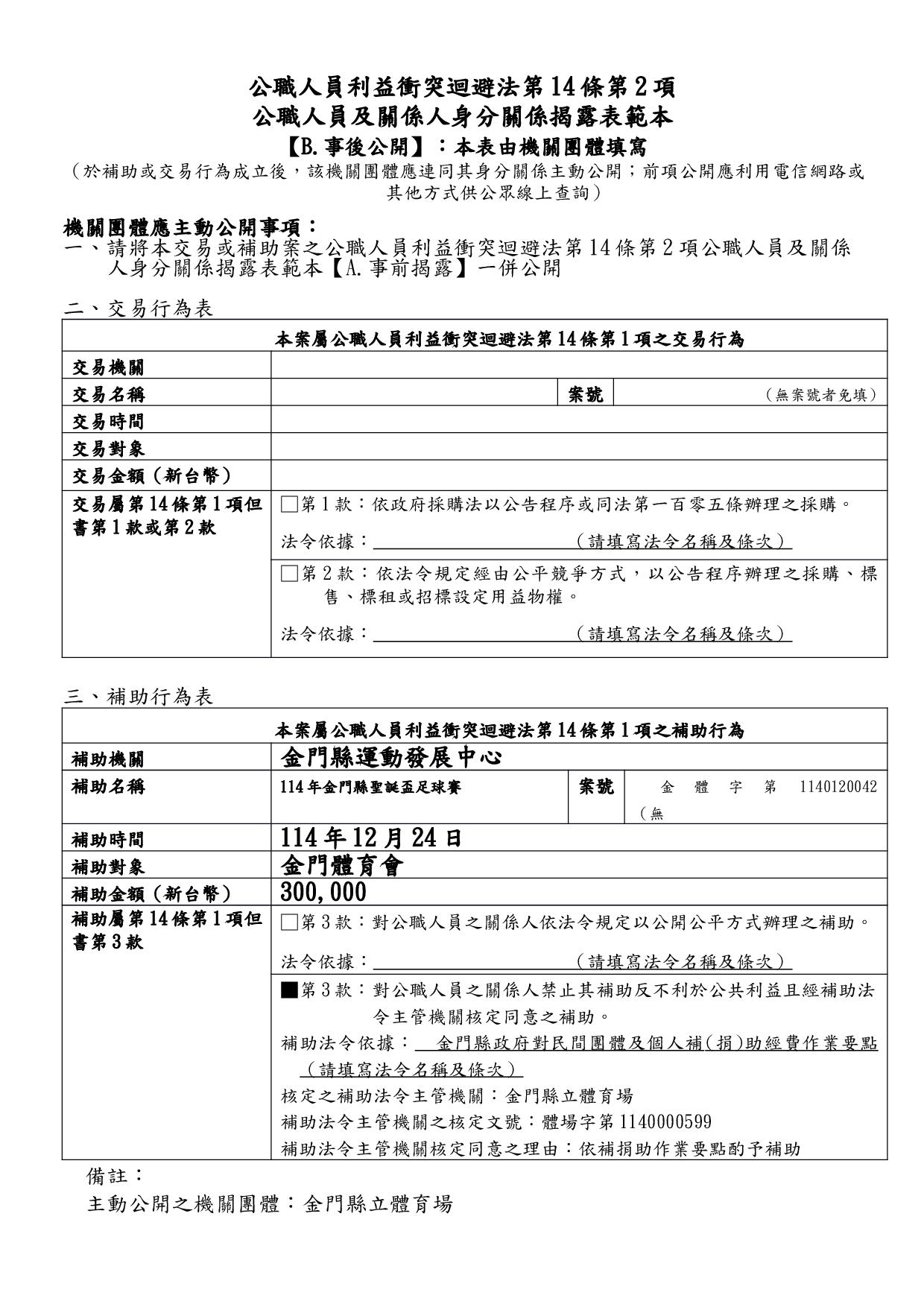 補助114年金門縣聖誕盃足球賽