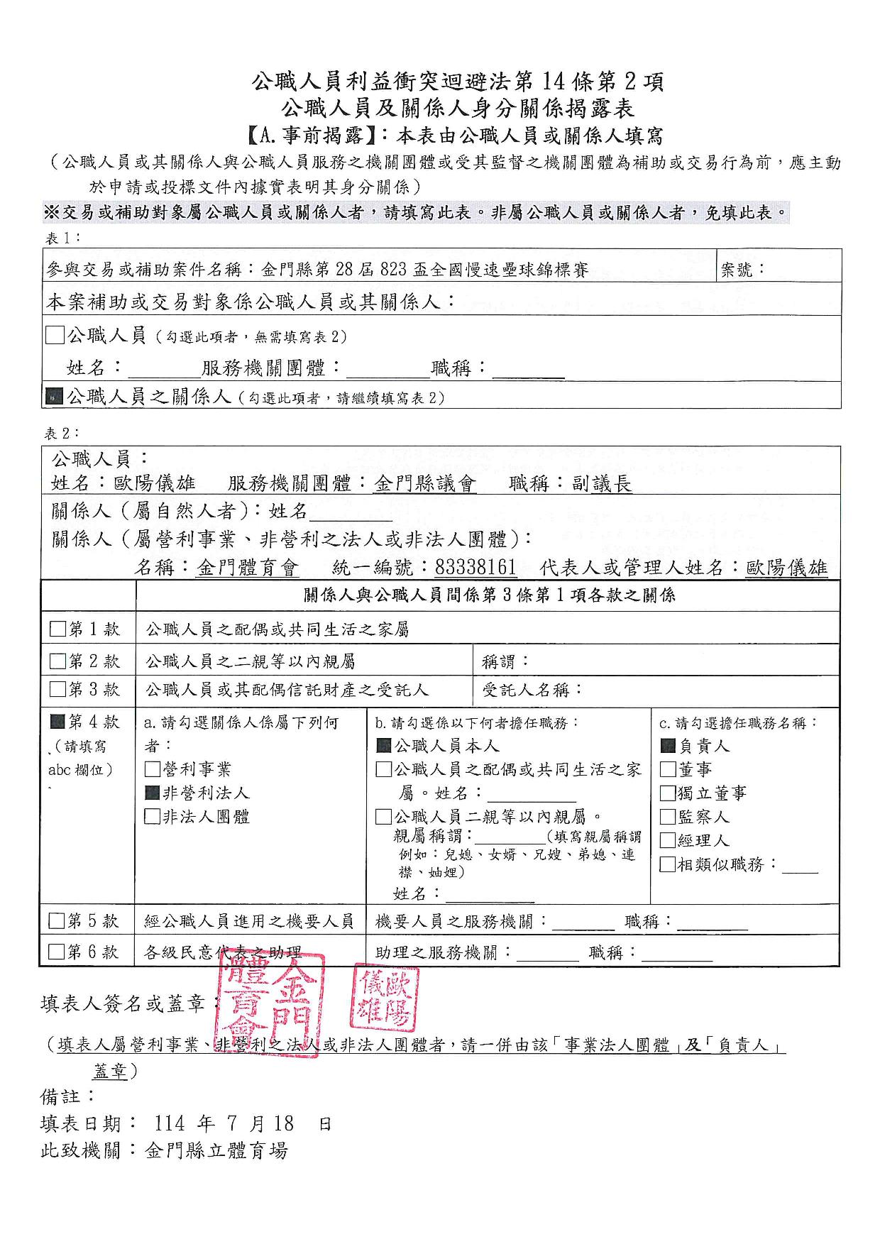 公告114年度「本場提供金門體育會暨所屬各單項運動委員會及本縣立案體育團體辦理各項活動補助」