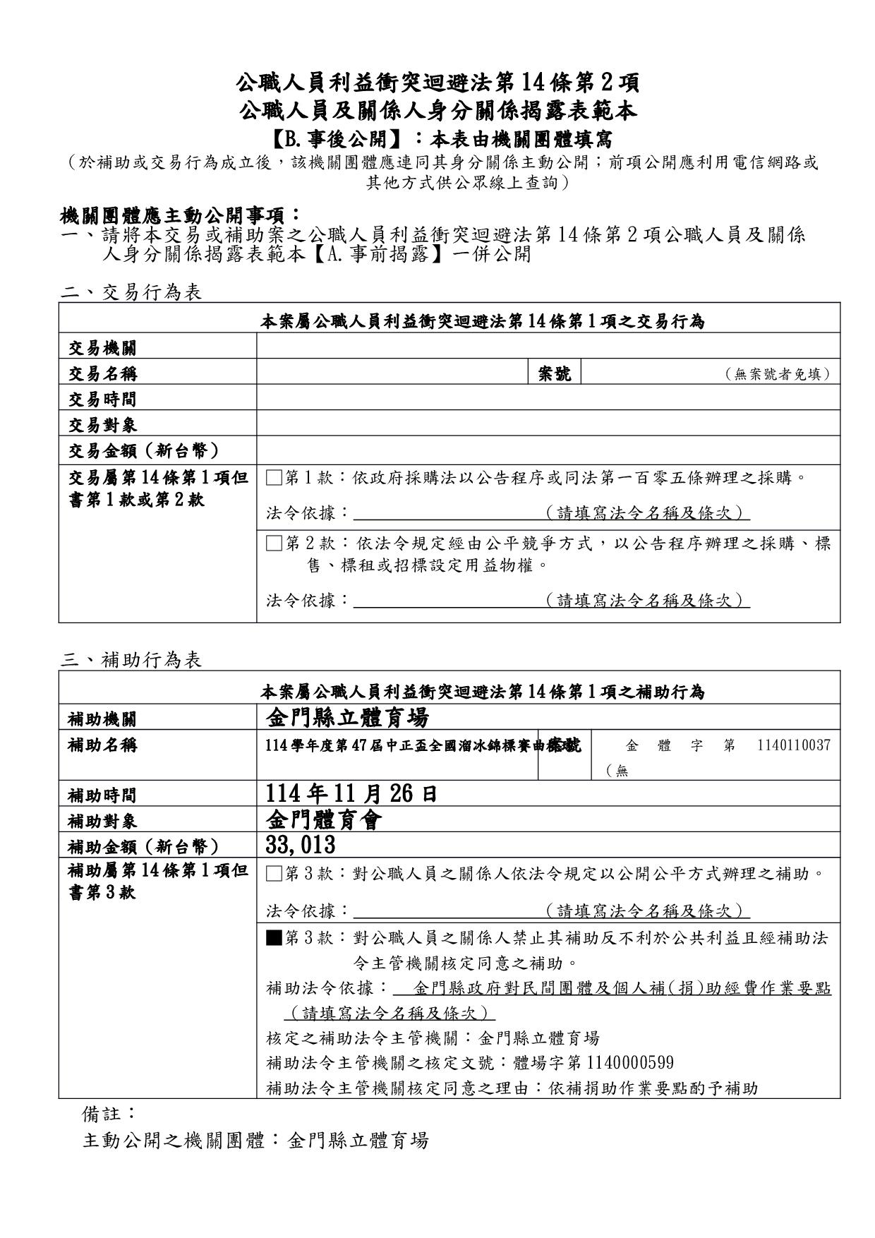 公告114年度「本場提供金門體育會暨所屬各單項運動委員會及本縣立案體育團體辦理各項活動補助」